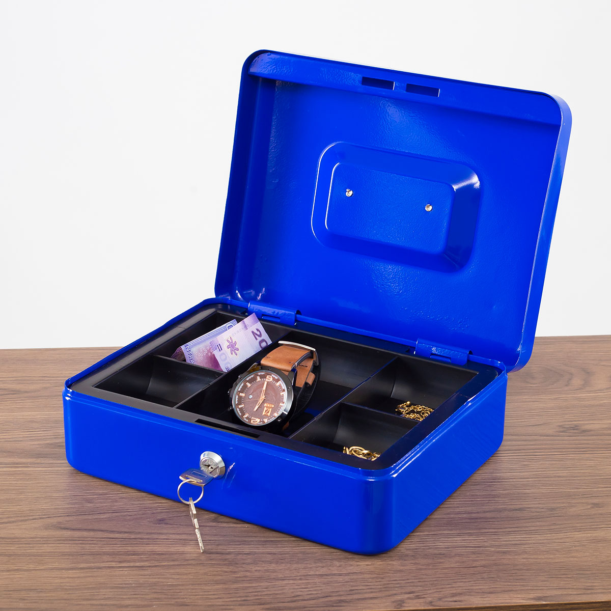 ¡Mantén tus objetos más preciados y personales a salvo! Con esta caja fuerte podrás cuidar tus objetos de valor como dinero, joyas, etc. El material es metálico, resistente a golpes y caídas y tiene una llave de cerradura para mayor seguridad. Tiene una bandeja interior desmontable con compartimentos para que puedas separar el dinero y los objetos que desees. El tamaño es ideal para poder transportarla con mayor comodidad. Este producto cuenta con variantes de color que serán seleccionados aleatoriamente en base a su disponibilidad.