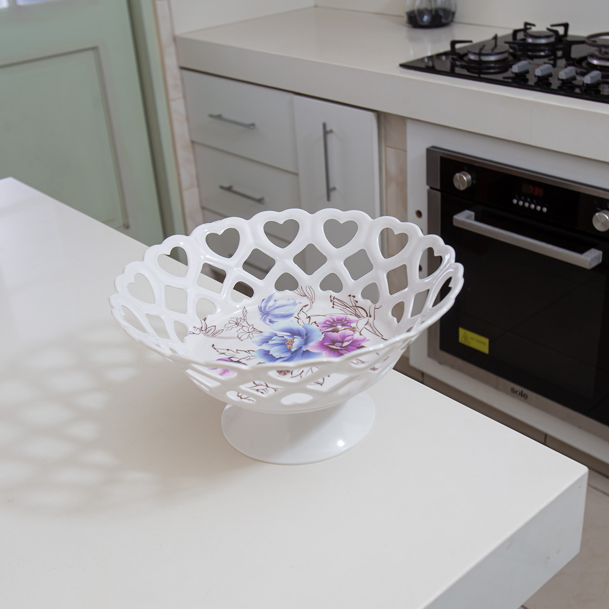 Cesta moderna de melamina con diseño abierto que permite la circulación del aire, ideal para frutas o pan.