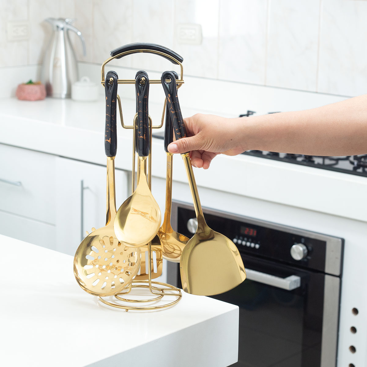 Emplea este hermoso juego de cucharones oro en las preparaciones de tus reZetas favoritas. Este set incluye: una espátula lisa, una espátula ranurada, una espumadera, un cucharón de sopa, un cucharón de arroz y un cucharon para pasta. Además viene en un elegante soporte para que los mantengas todos Zúper ordenados. El material es de larga duración y los mangos negros con diseño ergonómico te permitirán reducir el cansancio de tus manos al momento de usarlos.