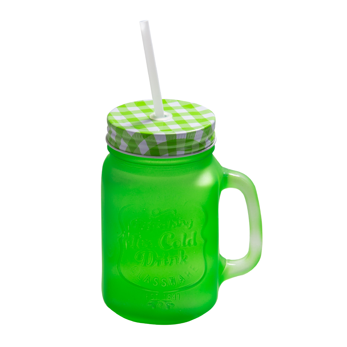 Jarrita de vidrio con asa, tapa enrroscable de metal y orificio para cañita. Perfecta para consumir tus bebidas favoritas con familiares y amigos.