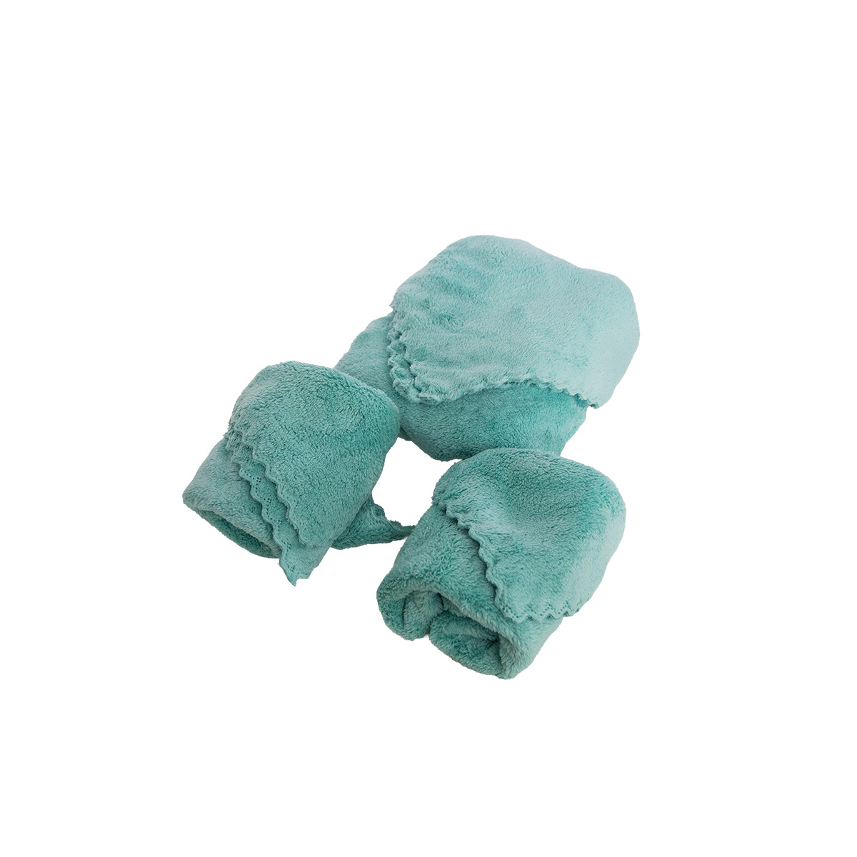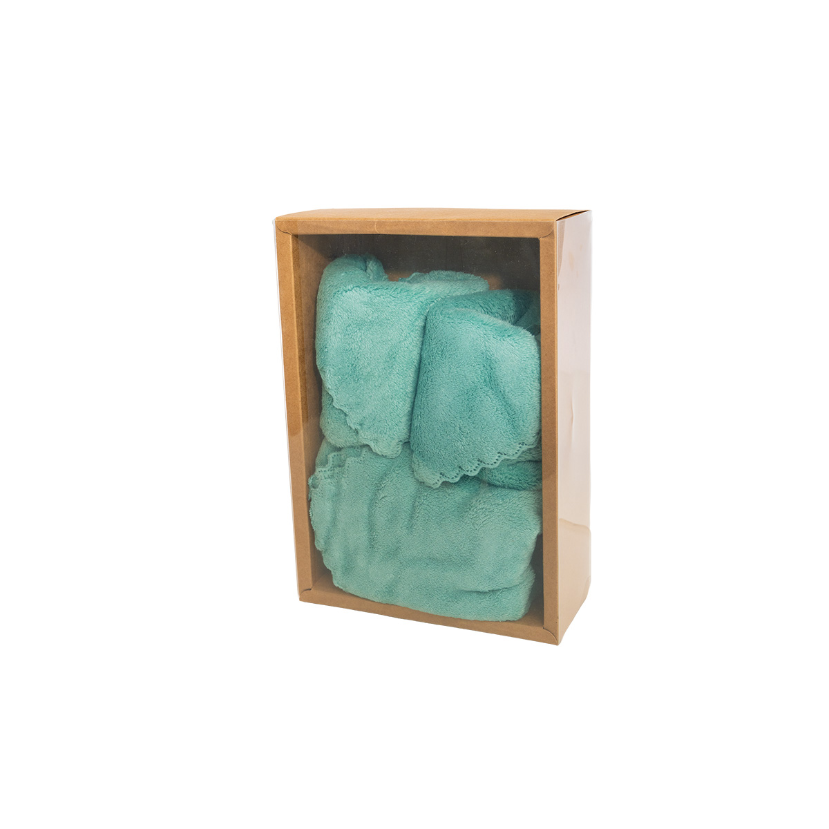 Este set incluye dos toallas de manos y una toalla de rostro, confeccionadas en vellón de coral, un tejido ultra suave, ligero y de alta absorción.