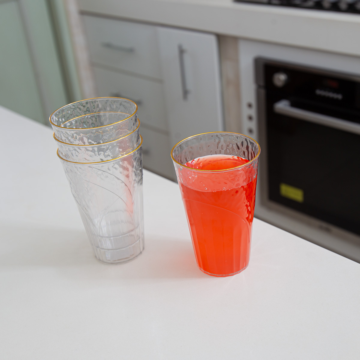 Cada vaso presenta un delicado borde dorado y un relieve decorativo con motivos de corazones y gotas de agua que crean un efecto visual atractivo.