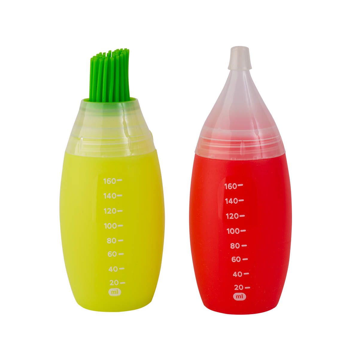 02 botellas de silicona de cuello ancho con marcas de medición. Incluyen tres tipos de boquillas: una fina para decorar (por ejemplo para pasteles), una gruesa (ideal para aderezos y salsas) y una brocha de silicona (útil para marinajes y repostería). Sus dos tapas herméticas permiten un fácil almacenamiento.