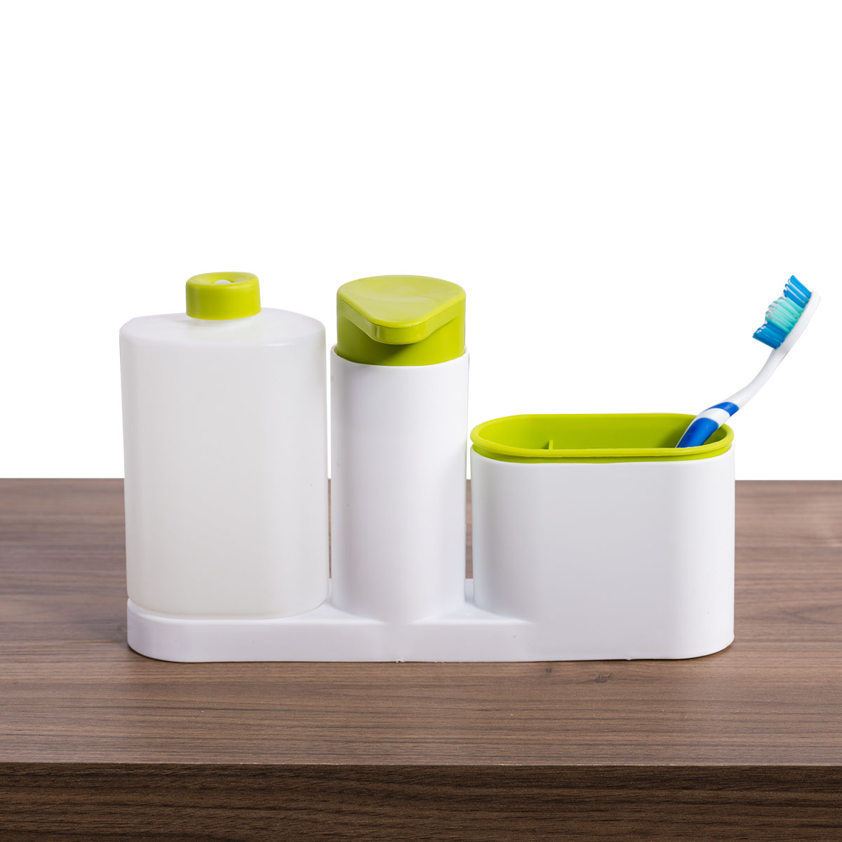 Organiza y decora el baño de tu casa, tu oficina o tu negocio con este set de accesorios. Trae un dispensador de jabón líquido, un envase para loción y un vaso para cepillos de dientes, peines o esponjas. Acomódalo según tus necesidades.