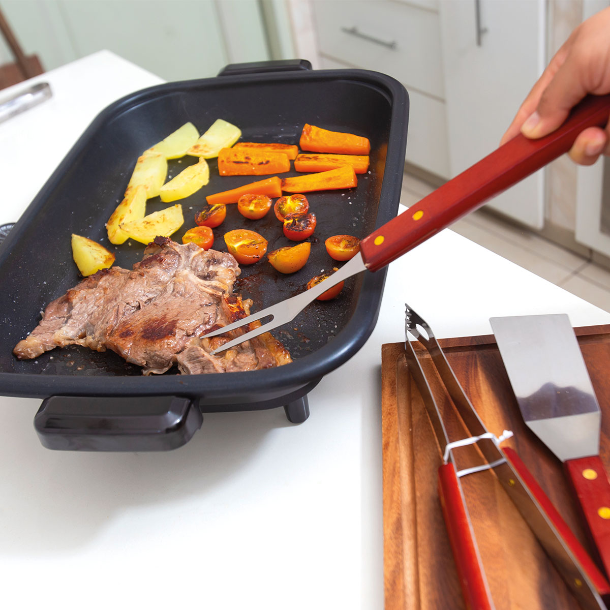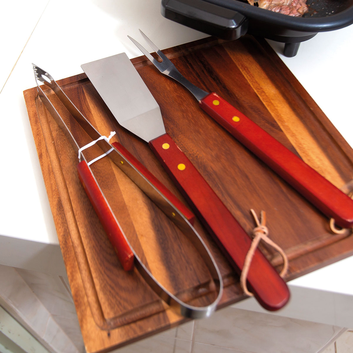 Domina el arte de la parrillada con nuestro Set de 3 Utensilios para Parrilla. Este kit incluye todo lo necesario para convertirte en el asador estrella de tu hogar. Fabricados con materiales de alta calidad, estos utensilios no solo son duraderos, sino que también te ofrecen la precisión y comodidad necesarias para cocinar a la perfección. Las herramientas son fáciles de limpiar con agua y jabón, y el mango de madera se puede mantener en óptimas condiciones con un cuidado adecuado.