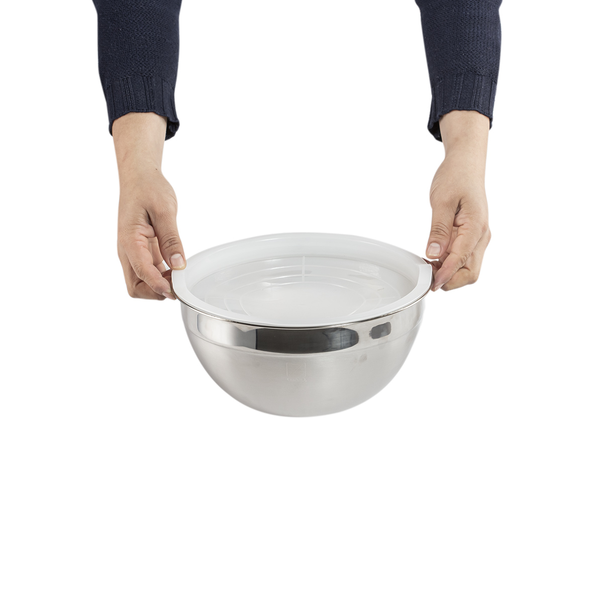 Tazón en acero inoxidable con tapa, ideal para almacenar frutas, ensaladas y cualquier otro alimento, manteniendo los nutrientes, sabores y aromas originales. ¡Infaltables en tu cocina!