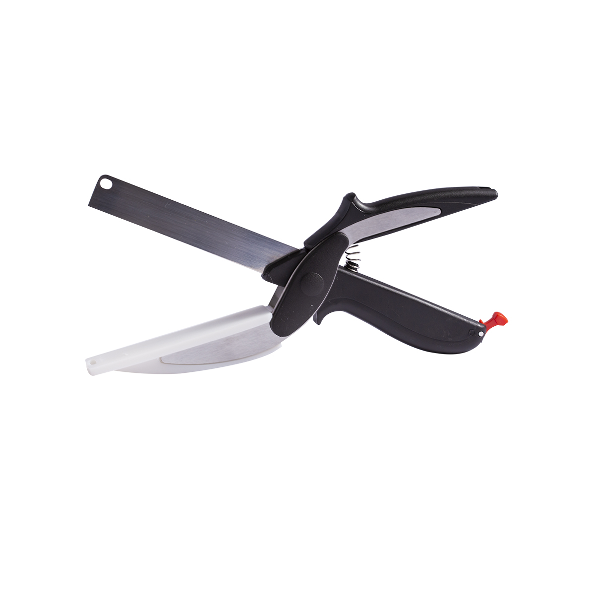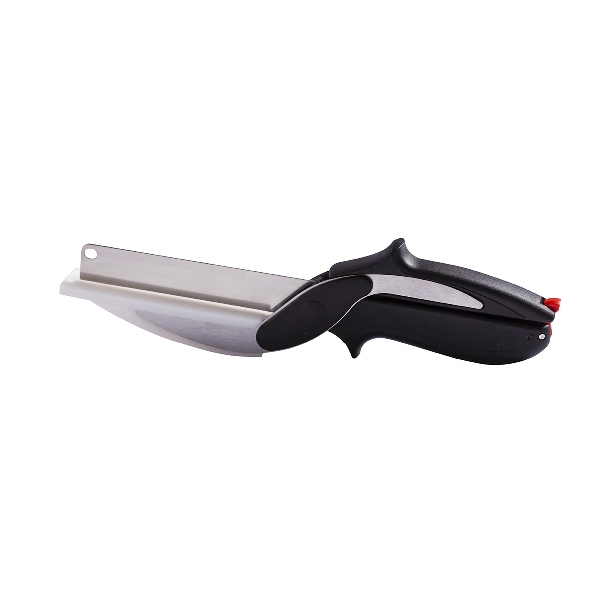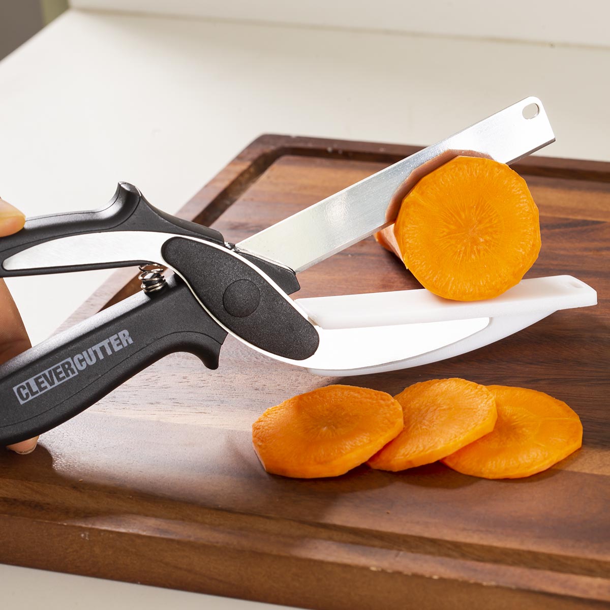 Este es un utensilio 2 en 1: cuchillo y tabla de cortar. La pequeña base plana funciona como tabla de picar, evitando que los alimentos cortados salgan disparados por toda la mesa. Puedes cortar alimentos de grandes dimensiones como una cebolla, ya que al trabajar con un efecto palanca, cuanto más abras tu mano, más se abrirán las hojas de corte. En segundos podrás tener lista una ensalada. El Clever Cutter incluye una bisagra de seguridad para que la bloquees al almacenarla y evites accidentes.