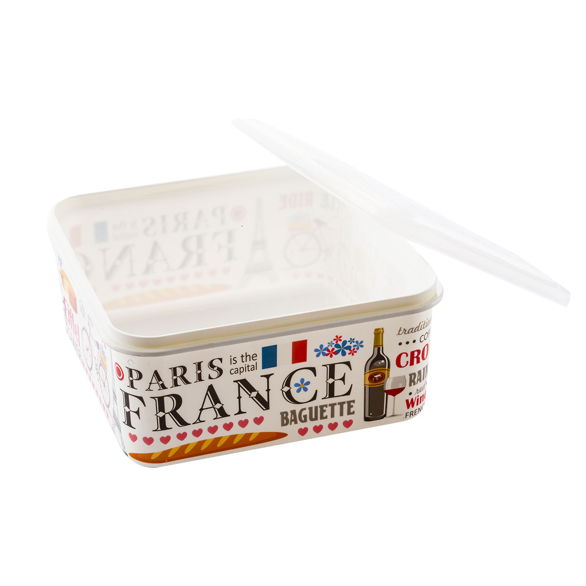 Este taper grande es parte de una colección de cuatro piezas inspirada en Francia. Podrás almacenar en él alimentos, granos, semillas y hacerlo tu aliado para las loncheras. Sin embargo, gracias a su diseño lo podrás incorporar como cajita de almacenamiento y decoración para tu hogar. Podrás guardar en él joyas, cables y cargadores, maquillaje y muchas otras cosas más.